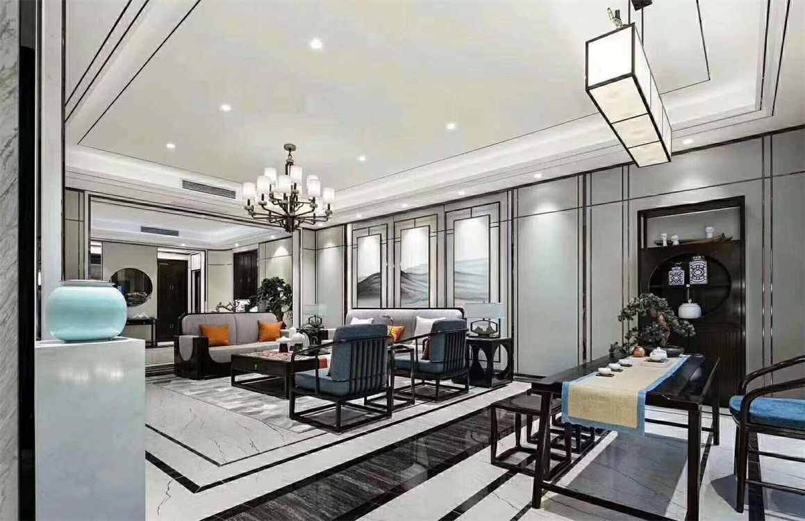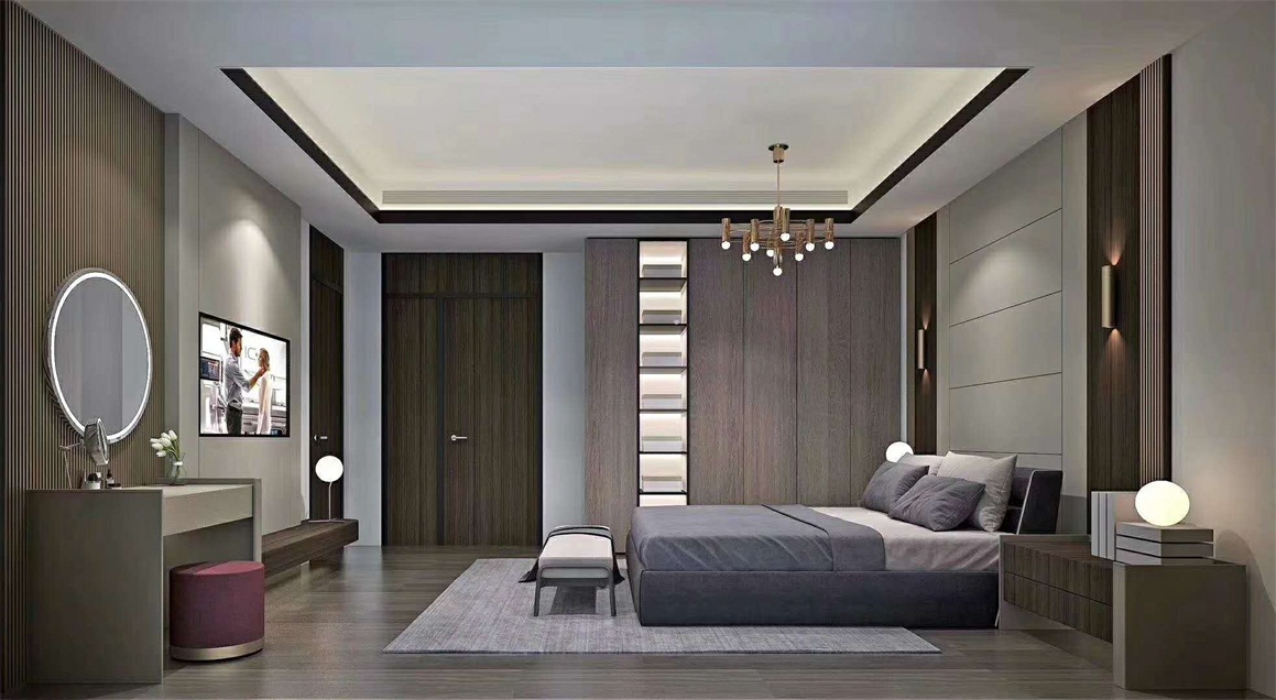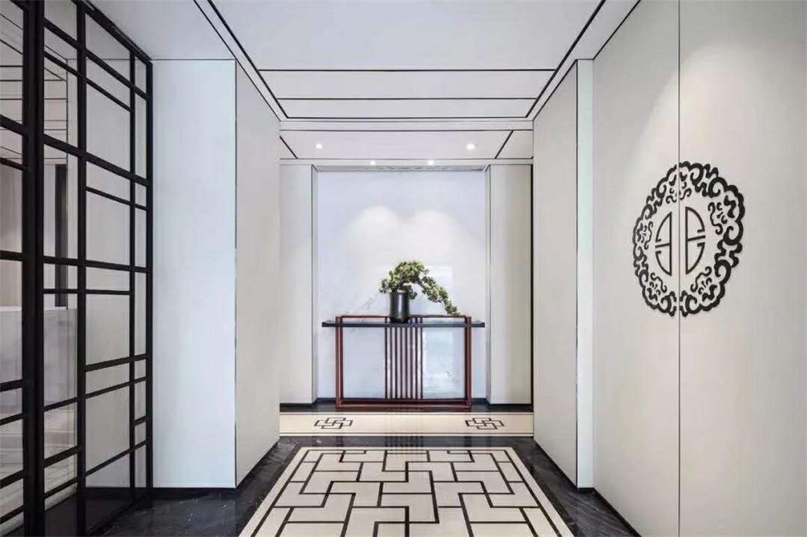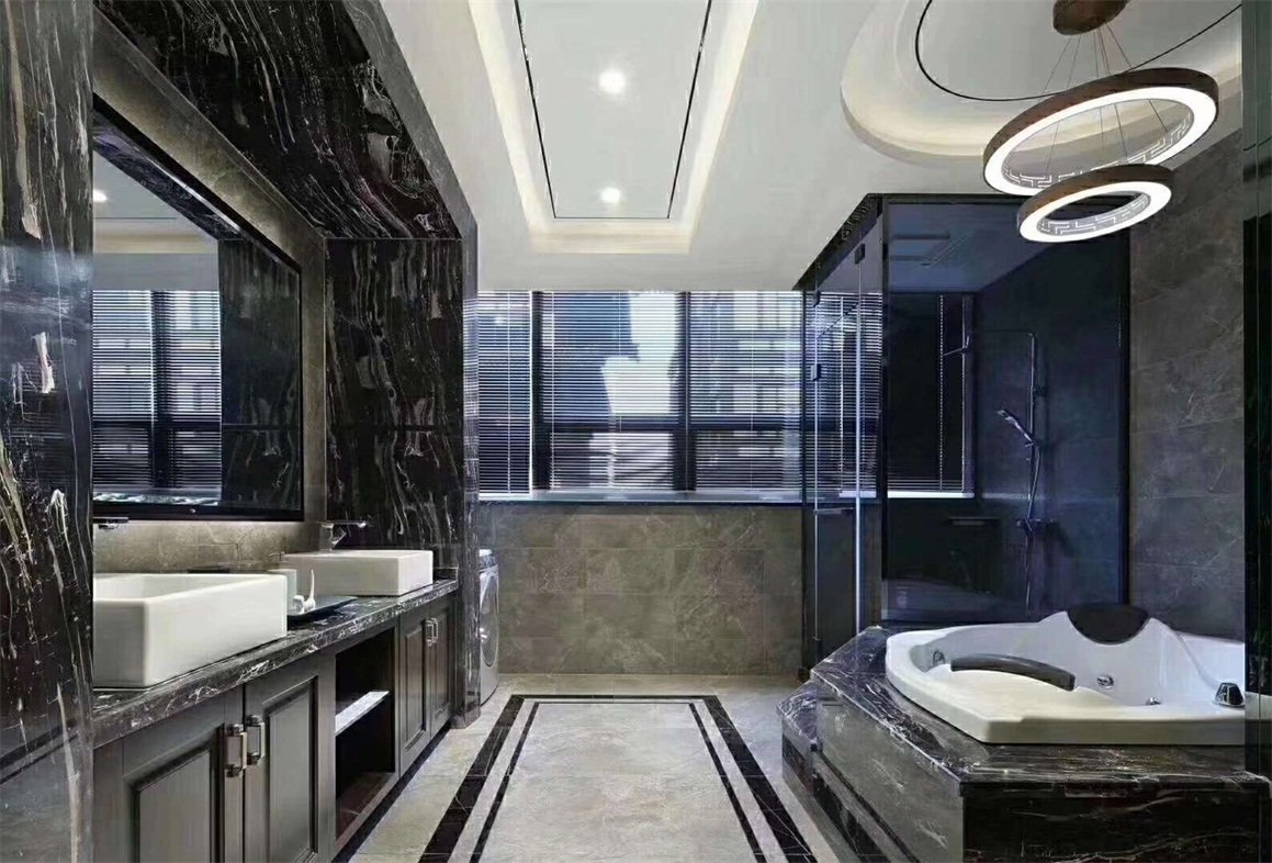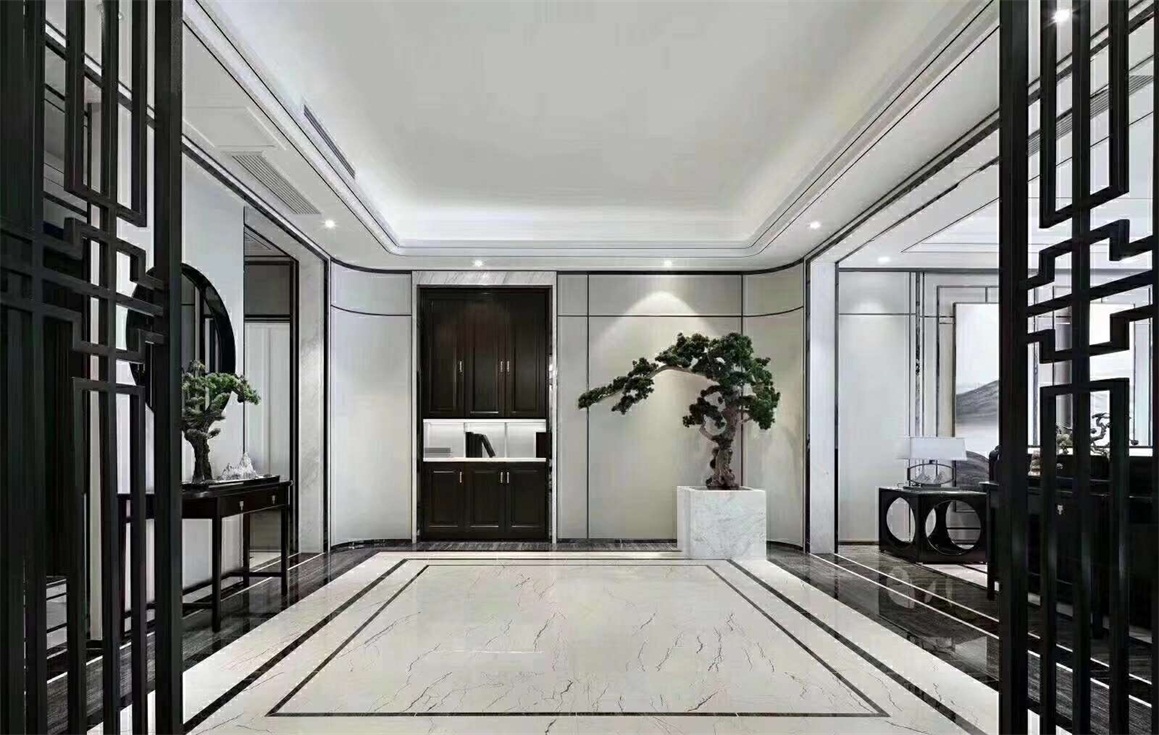 大理石瓷磚、木地板、不銹鋼線條、定制實木護墻板、乳膠漆。