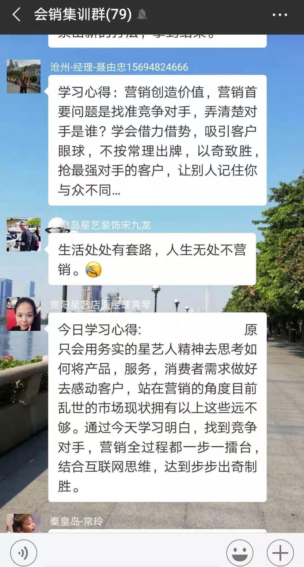 以品宣,以奇勝,打造家裝行業高效營銷團隊,構建企業低成本創品牌的快速營銷系統。12月3日至5日,廣東星藝裝飾集團“奇勝營銷”會銷集訓在廣州舉行。來自星藝29家公司的總經理、營銷團隊管理者、營銷策劃負責人共70多人參加集訓。集團董事長兼總裁余敏、常務副總裁孫師恒、總裁助理黃勇、行政中心總監郝峻、營銷中心總監陳和君等到場聽課,對構架星藝營銷系統和打造高效營銷團隊提出具體要求和作出明確指示。