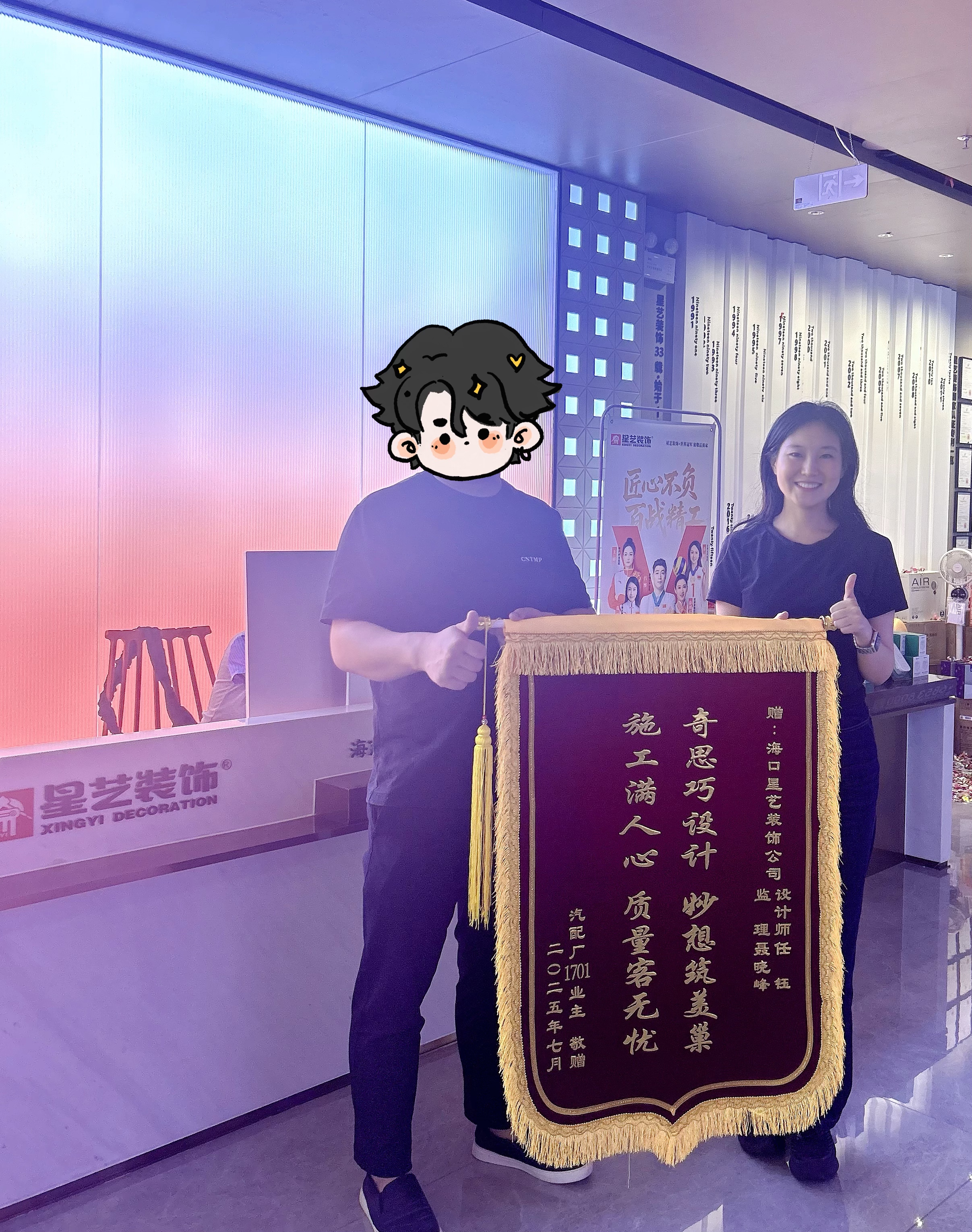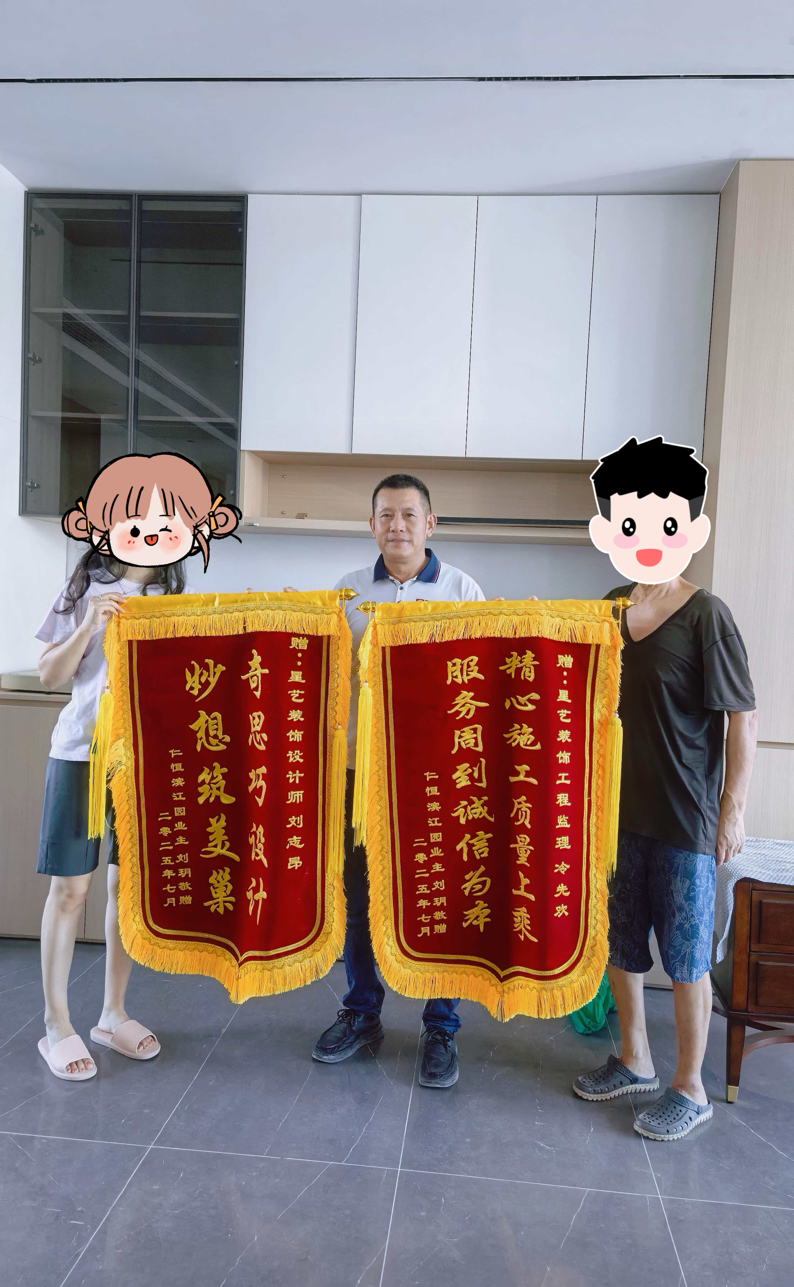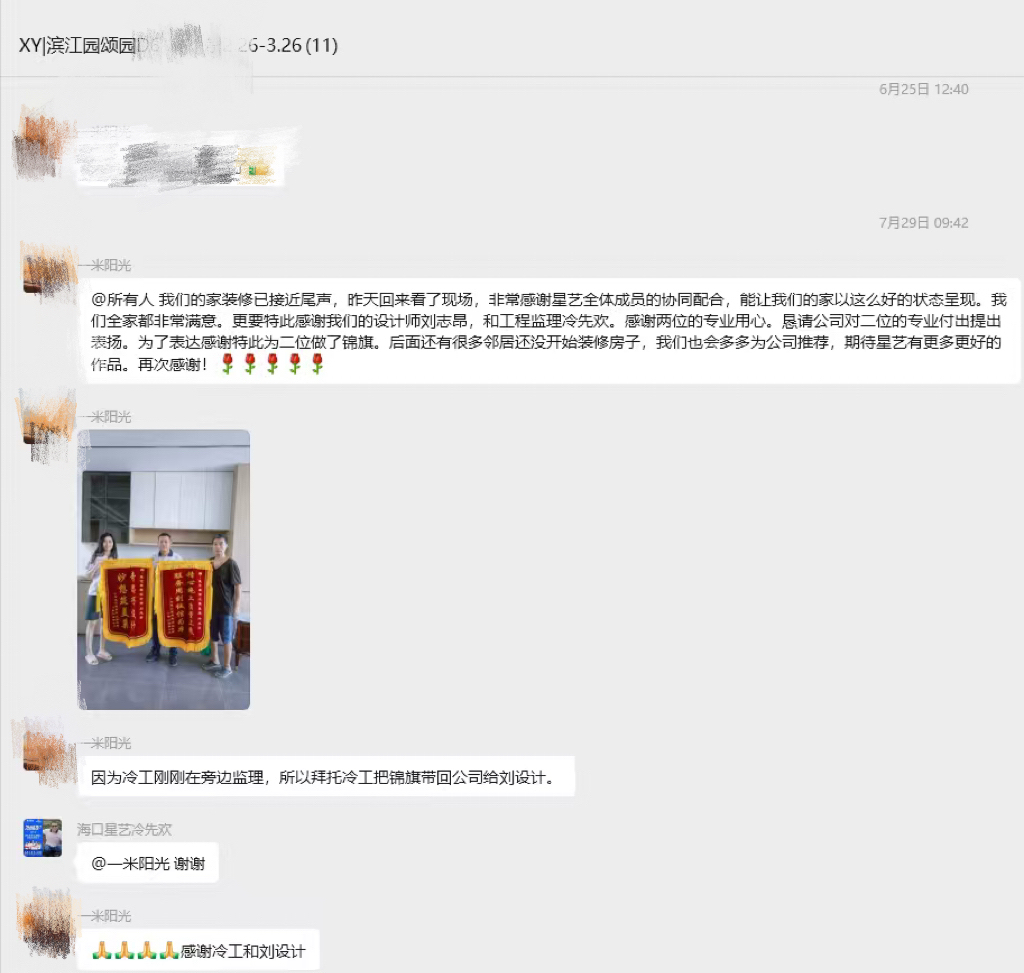 非常感謝星藝全體成員的協(xié)同配合,能讓我們的家以這么好的狀態(tài)呈現(xiàn),我們?nèi)叶挤浅M意。更要特此感謝我們的設(shè)計師劉志昂,和工程監(jiān)理冷先歡,感謝兩位的專業(yè)用心。懇請公司對二位的專業(yè)付出提出表揚。為了表達感謝特此為二位做了錦旗。后面還有很多鄰居還沒開始裝修房子,我們也會多多為公司推薦,期待星藝有更多更好的作品。再次感謝!